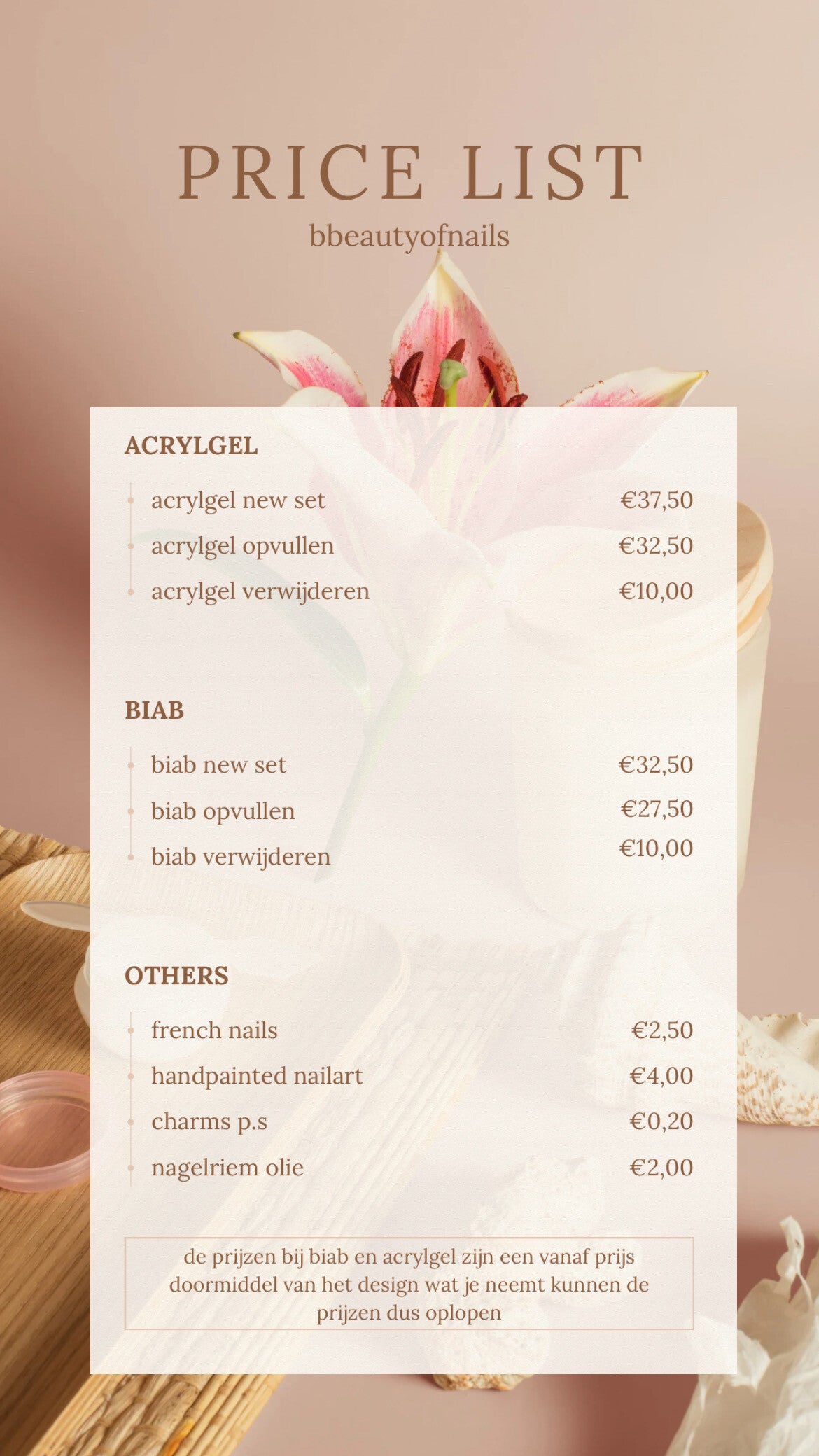 Bbeautyofnails brengt haar eigen expertise en passie mee, zodat je altijd de beste zorg krijgt. Bekijk hieronder onze behandelingen en bijbehorende prijzen